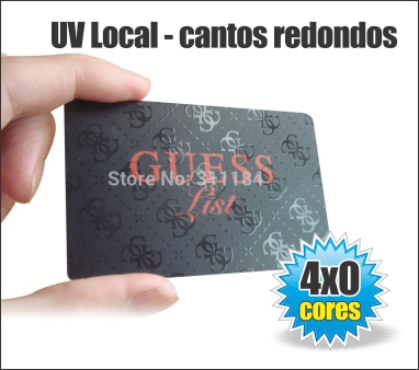O cartão conta ainda com verniz localizado, só para você entender o que isso quer dizer, basicamente, o verniz pode ser aplicado em qualquer área do cartão, como por exemplo, somente no seu nome ou no logotipo da empresa; ou seja, você escolhe onde deseja que o verniz seja aplicado.