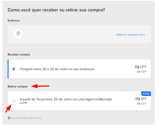 “Retire em uma agência do Mercado Livre”, indicando o valor – geralmente mais barato